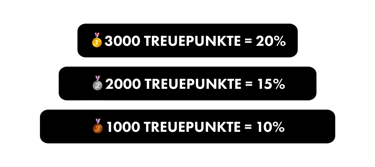 Umso mehr Treuepunkte du hast, umso höhere Rabatte schaltest du frei. Die Rabatte kannst du dann ganz bequem bei deinem nächsten Einkauf im Checkout einlösen.