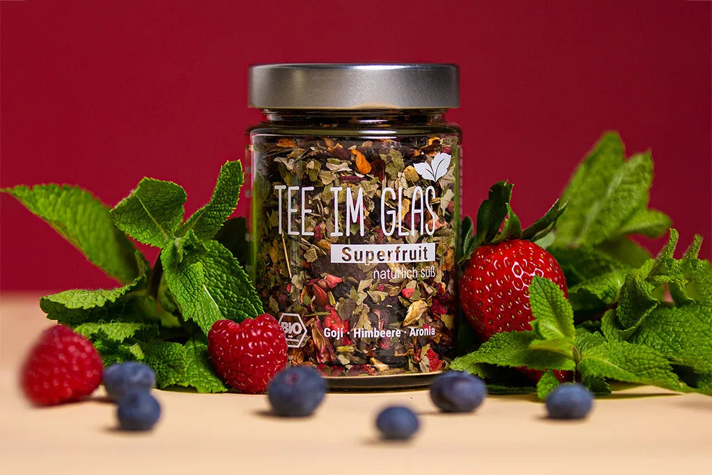 Unsere Vision: Die Tee-Branche revolutionieren! Zu zweit mixten wir in der WG-Küche, was das Zeug hielt. Die Idee: Natürlich süßer Tee, hochwertigste Bio-Zutaten, verpackt im Glas mit einem nachhaltigen Nachfüll-Prinzip. Getauft wurde das Ganze so simpel wie genial: TEE IM GLAS.