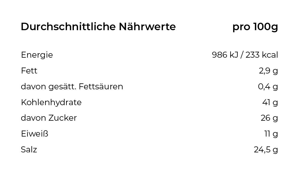 Salz (Indische Sonnenflocken), Bio-Dill, Bio-Kokosblütenzucker, Bio-Zwiebel, Bio-Schnittlauch, Bio-Petersilie, Bio-Paprika, Bio-Knoblauch, Bio-Rosa Beeren, Bio-Timut Pfeffer.