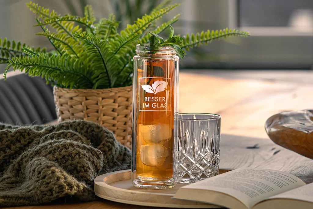Die praktische To Go-Glasflasche - perfekt, um deinen Eistee vorzubereiten und mitzunehmen. Die Lösung, um tagsüber endlich genug zu trinken!