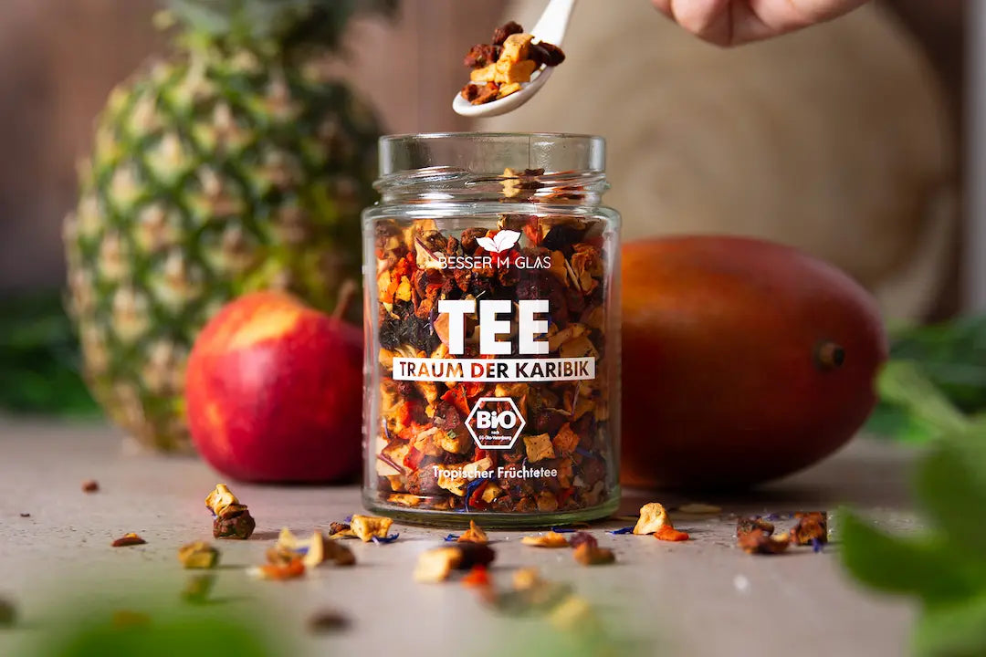Traum der Karibik: Bio Früchtetee mit Bio Karottenflocken aromatisiert mit Mango-, Bergamott- und Tonkabohnengeschmack: Bio-Apfel, 15% Bio-Karottenflocken, Bio-Sultanine, Säuerungsmittel: Citronensäure, Bio-geröstete Kokosnusschips, Bio-Süßkraut, natürliches Mangoaroma, Bio-Ananasstücke, Bio-Kornblumenblüten, Bergamottöl, natürliches Tonkabohnenaroma.