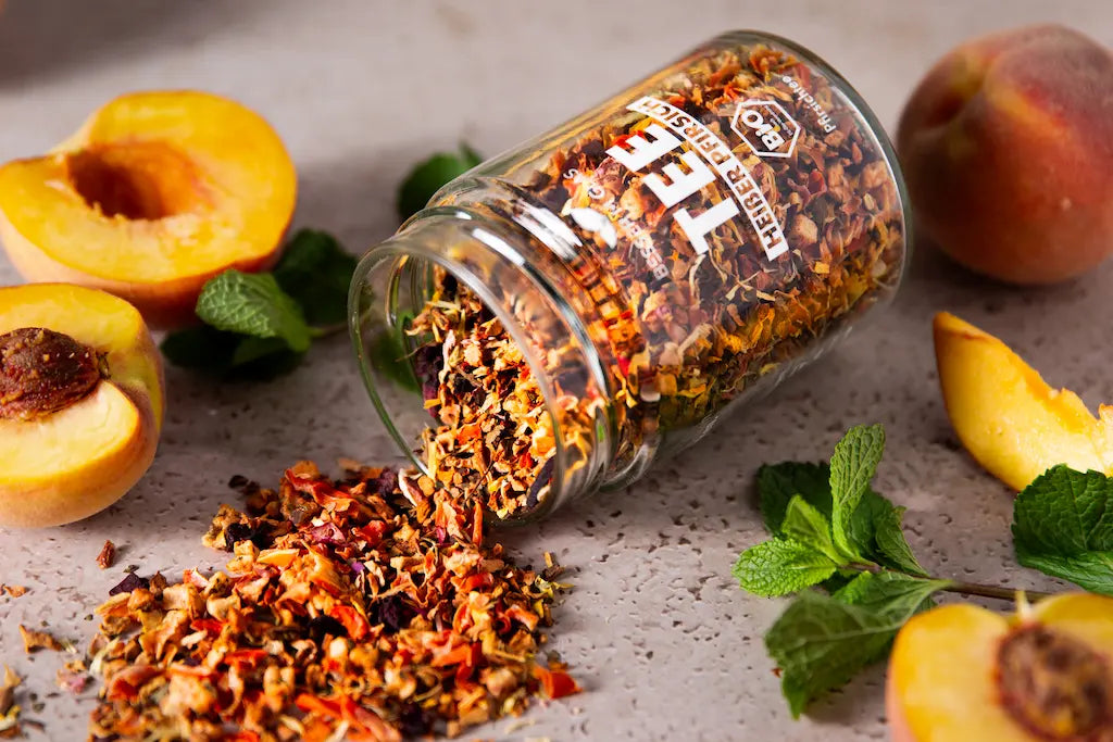 Bio-Apfel, Bio-Karottenflocken, Bio-Rote Beete, Bio-süße Brombeerblätter, natürliches Mangoaroma, Bio-Süßkraut, Bio-Ringelblumenblüten, 1% Bio-Pfirsichstücke, Bio-Rosenblütenblätter, natürliches Vanillearoma, natürliches Pfirsicharoma