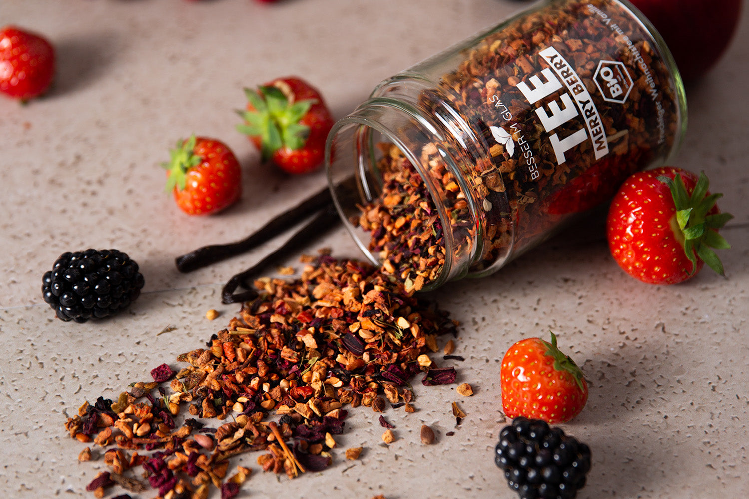 Sommerliche Beeren auch im Winter? Die weihnachtliche Beerenmischung mit der süßlichen Vanille Note zaubern dir eine heiße Liebe, die auch im Sommer schmeckt! Ein fruchtig-süßes Tee-Erlebnis der besonderen Art.