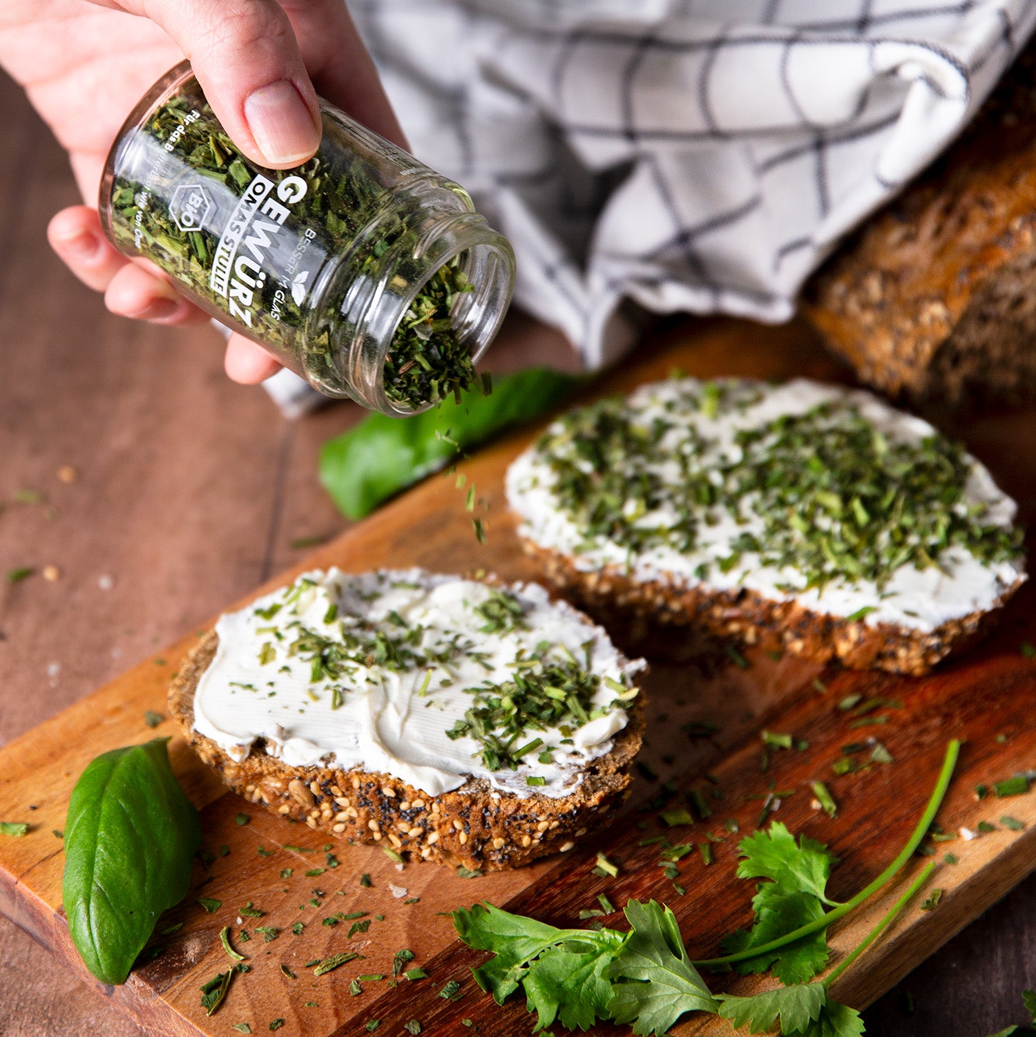 Was gibt es für einen besseren Belag als frische Kräuter aus Omas Garten? Hol dir jetzt deinen Kräutergarten nach Hause mit Omas Stulle! Die Mischung aus Bärlauch, Petersilie und Schnittlauch macht dein Butterbrot zu einem ganz besonderen Geschmackserlebnis!