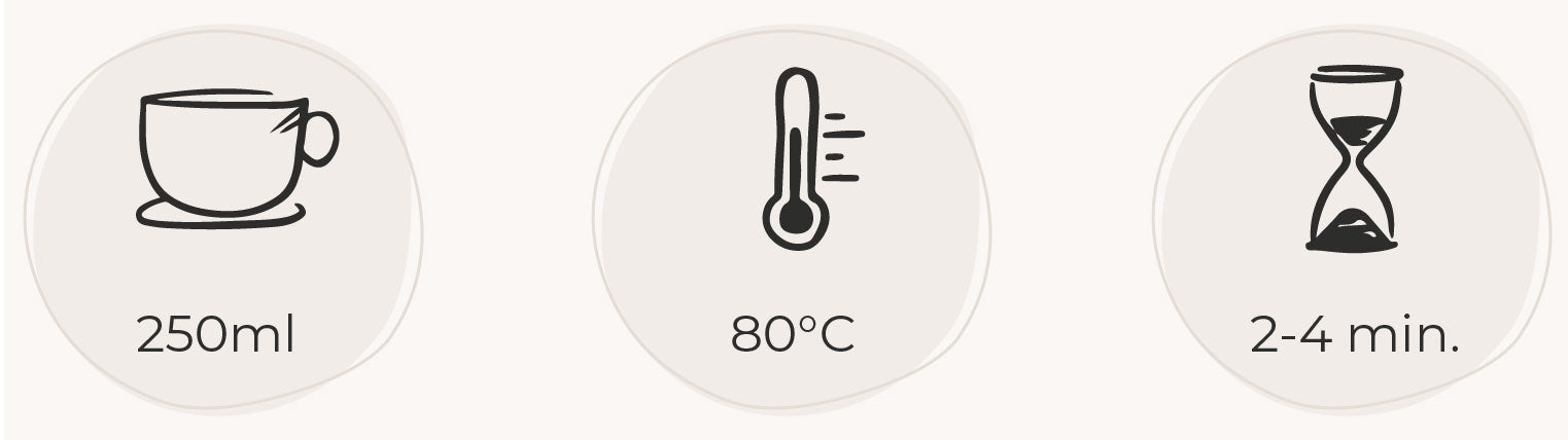 Wir empfehlen 1-2 TL unseres Original Darjeeling mit 80°C heißem Wasser aufzugießen und 2-4 Min. ziehen zu lassen.