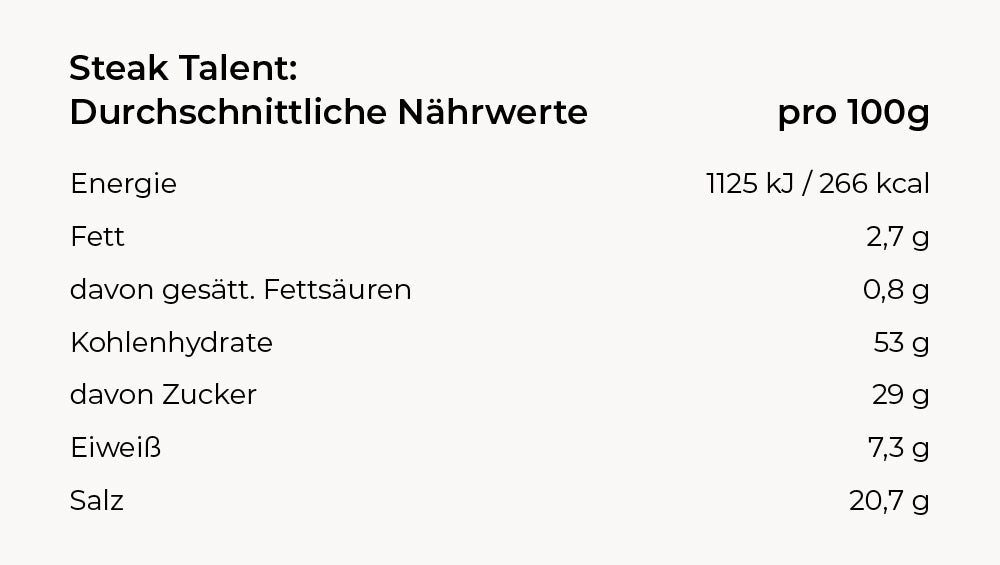 Unser Steak Talent kombiniert Pfeffer Schärfe mit einer leicht karamelligen Süße und kann einfach auf dein Steak gestreut werden.