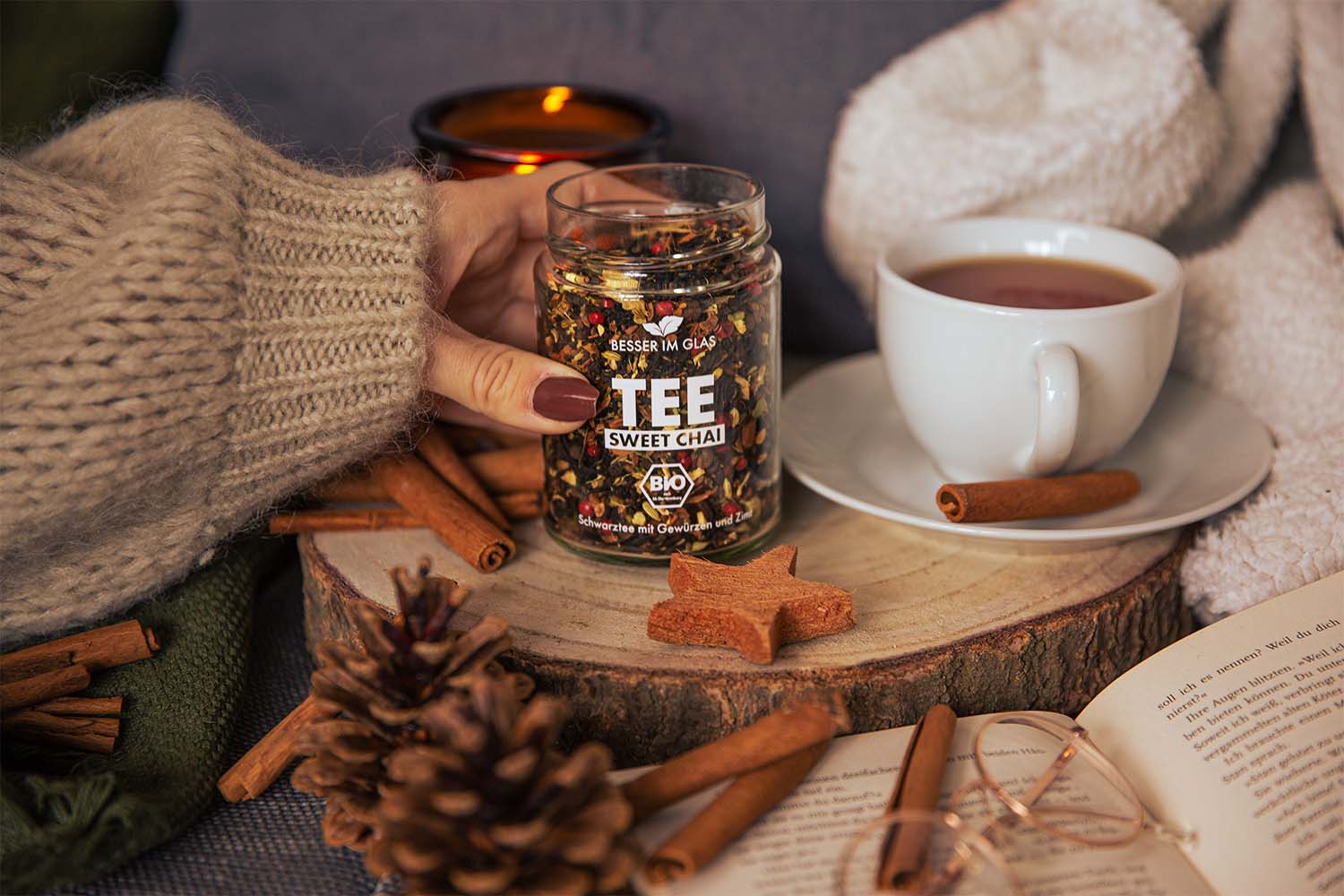 Mischung aus Bio Gewürzen, Bio Kräutern und Bio Schwarzem Tee mit Kardamom- und Vanillearoma: