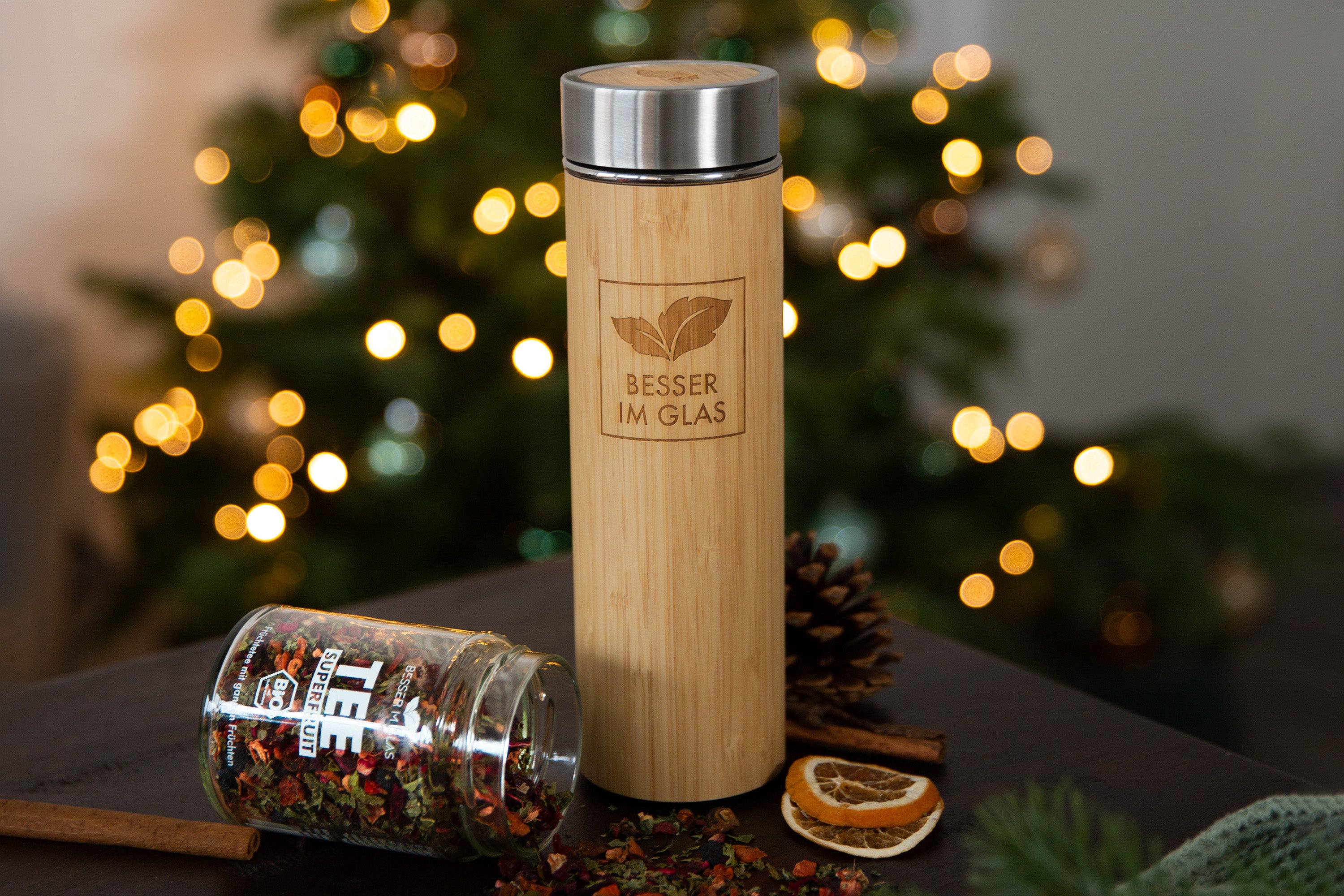 Unsere Thermosflasche sieht nicht nur gut aus, sondern hat es auch wahrlich in sich! Sie hält deinen Tee bis zu 10 Stunden warm und begleitet dich den ganzen Tag mit deinem Lieblingstee.